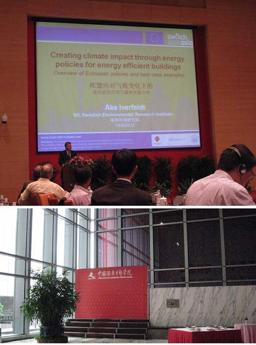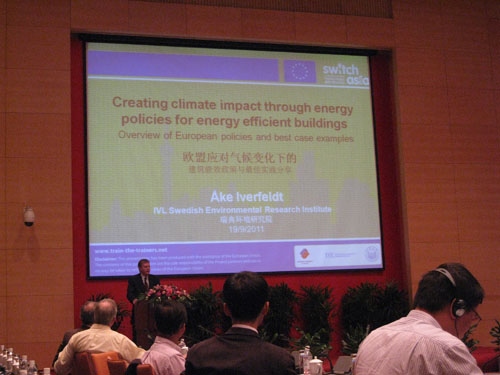 作为唯一的欧洲演讲嘉宾,瑞典环境科学研究学院副总裁Ake Iverfeldt代表项目组发表主题为“欧盟应对气候变化下的建筑能效政策和最佳实践分享”的主旨演讲。在一个小时的演讲中,Ake 分享了欧盟建筑能耗2020目标框架下的政策,标准和实施纲要。同时,引用了奥地利、法国、德国、罗马尼亚和瑞典的项目案例引证欧盟政策走向及在中国分享相关欧洲经验的可能性和操作性。 Ake的演讲获得了政府官员的热烈关注,来自浙江、重庆、广西、江苏和湖北等地的政府官员就欧盟的能效政策推广、成本控制、如何兼顾经济发展和当前的危机与挑战等角度提问,双方进一步深入探讨了中国如何借鉴欧盟的经验。