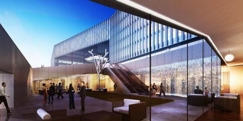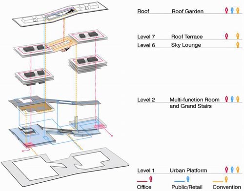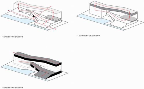 (图片来源:designboom) 国际知名事务所aedas最近完成了方案“the urban crossing”的设计,这个综合体建筑将建在上海临空经济园区。基地与河流、人行步道和公共广场相邻,大楼梯从建筑正前方的河水中浮出,将参观者引入两座办公楼之间的楼前广场上。分立两端的办公塔楼之间有两条空中步道相连,标志性的巨大入口则将两条空中步道编织在一起,形成丰富的户外空间。虽然这座建筑的外观看起来比较统一,但其内部空间十分丰富,各个楼层上都有各种不同的平台,为使用者提供了不同角度的城市风景。