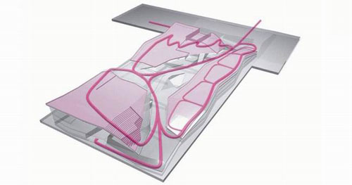 北广场(图片来源:designboom) 这座三层的建筑包含了一座圆形剧场,邮轮码头,咖啡厅和餐厅,人们可以通过一条人行步道到达这些功能区以及屋顶公园。人行道路围绕着建筑物布置,从中延伸 出来的小岔路还可以直达屋顶。道路从基地边界开始到海边结束,最终形成了一个滨海散步长廊。穿插在首层和建筑上层的广场创造了一系列观景节点,在主体建筑 物中形成一系列绿色休闲空间。