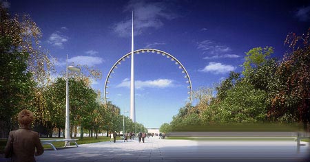 (图片来源:自由建筑报道 ) 如同著名的"伦敦眼"一样,游客将坐在密封舱里观赏景色。"莫斯科风景"摩天轮有48个密封舱,在单轨风格的环形轨道上滑动,外观是白色金属质感的。除了摩天轮,在底部3万平方米的空间里设置了文化、娱乐和零售空间等。 该项目还有一座围绕着池塘建造的圆形剧场。冬季这座池塘将冰冻起来,成为一座临时性的溜冰场。摩天轮的实际高度是320米,将成为世界上最高的观景摩天轮。 |