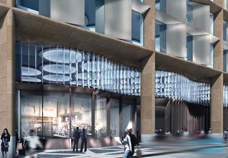 (图片来源:自由建筑报道 ) 该计划的开发管理方是 Stanhope 公司,两座楼之间用带顶的连廊相连,砂石立面上带有金属遮阳板。两座楼的二层、四层和六层分别由桥梁连接。 这一设计方案是因为场地条件所限,特别是为了保护圣保罗大教堂的景观走廊而限制的建筑高度。该场地上 任何项目都必须有一个新的入口通道,通向旁边的地铁“银行站”。福斯特事务所还设计了两座广场,与办公楼底层的餐厅和零售店有通道连接。 福斯特表示, Bloomberg Place 是高质量的耐久建筑,将随着时间流逝成为历史背景中的一道地标。 这是福斯特事务所在该场地上设计的第二个项目。前面的项目是与让·努维尔合作设计的 Walbrook 广场,造价 3 亿英镑,被戏称为“达斯·维德的头盔”( Darth Vader’s Helmet )。后者曾在 2007 年获得规划许可,但是西班牙开发商 Metrovacesa 公司随后取消了该计划。 |