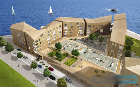 (图片来源:自由建筑报道) "挪威木构"位于海滨,浓缩了城市的精华,发展了当地传统木质建筑的传统,同时诠释出挪威景观的特色。建筑的外形是在对场地经过仔细分析后得出的,如同城 市与大海交接边缘上的一座木质山峦,模糊了城市空间与传统挪威景观之间的界线。巷道、公共广场以及住宅和商业单元之间的交互形成富有活力的氛围,提供了各 种生活体验。