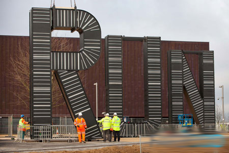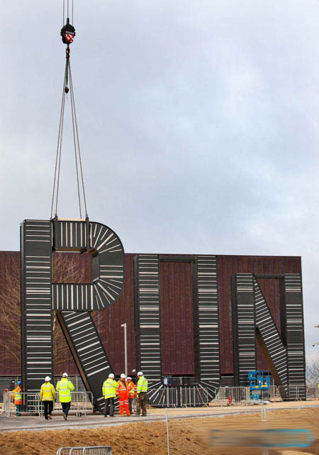 (图片来源:自由建筑报道) 这座雕塑有三个9米高的大写字母,每一个字母重达10吨,使用钢和反射玻璃制作的,白天有镜面效果,晚上则利用LED照明放射出光芒。所有的组件将在6周内安装完毕,包括玻璃和305米的节能LED照明设施。