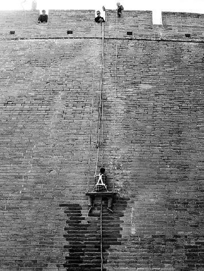 (图片来源:互联网) “一下火车,就能看到城墙。有城墙,才是名副其实的古城。西安城墙原来只有4个城门,后来的14个城门、豁口都是后来开的,其中最大的是目前火车站城门。” 中山门玉祥门 命名各有寓意 韩保全介绍,南城墙的勿幕门,俗称小南门,为纪念辛亥革命中陕西的革命先烈井勿幕先生。西城墙的玉祥门是为纪念冯将军由此率部入城。东城墙的中山门,以纪念国民革命领袖孙中山先生得名。原来火车站站前广场是一个巨大的豁口,当时也有一座城门。“后来毁了,再没修建。”韩保全说,直到2004年整个城墙贯通。 “14处城门、豁口累计下来大约1200米,同时城墙顶上的铺砖损坏殆尽。”韩保全说,1983、1984年,省市政府大规模整修城墙。“可以说西安城墙能保存到现在很不容易。” 城墙“美容” 昨日,西安市含光门外,几名工人用砂轮打磨城墙上的黑印迹。据正在施工的工人介绍,把修补城墙裂缝留下的水泥和胶的黑印子打磨后,城墙颜色就和原来的比较接近。此前本报曾在3月22日以《城墙咋被抹黑了》报道了这一城墙在维修过程中被抹黑。当时城墙景区管理办公室的工作人员解释,被抹黑的这处城墙为32号马面(马面,城墙建筑上的一种防御工事,也叫敌台、墩台),正在进行墙体裂缝的修补,黑色涂抹物是一种防水材料。 |