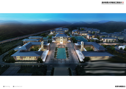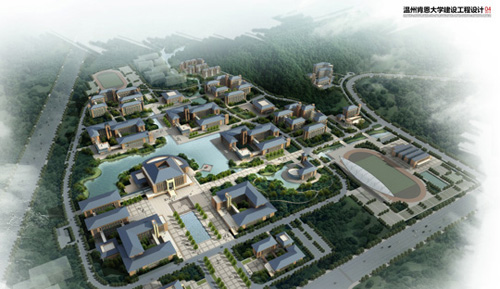 整体鸟瞰图(图片来源:人民网) “让温州孩子在自己家门口留学”的学校会是什么样子?昨日,中美合作的温州肯恩大学建设工程设计项目中标单位最终确定,由中国工程院院士、中国工程设计大师何镜堂领衔的华南理工大学建筑设计研究院夺得设计权。该项目一期一标段2013年秋有望投入使用。 据介绍,温州肯恩大学建设工程设计项目招标共吸引了国内外25家优秀设计单位参与角逐。最终华南理工大学建筑设计研究院以“现代校园,中美交融;山水校园,人文圣殿;前庭后园,特色书院”的设计理念夺得设计权。 从此次公布的效果图来看,设计中的校园,中国园林水乡意境结合西式建筑造的造型体现了中美校园文化的融合,有独特的书院校园风貌。该方案负责人之一寿劲秋博士表示,学院依山而建,延续传统书院空间,从整个校园生态环境到单体建筑内部,营造多层次的园林空间,体现“山水温州”的地域特色;另一方面,在建筑布局上,突出“前庭后园,特色书院”,形成“前广场,后花园”的格局环境。该设计方案还将进一步修改完善。 温州肯恩大学建设工程项目选址于丽岙街道,用地约1059.4 亩,校园建设地上建筑面积约 30.5 万平方米,地下建筑面积约 1.2 万平方米。筹建期内,美国肯恩大学将与温州大学先期开展合作办学项目,今年秋季拟开办经济学(国际金融、国际会计方向)、英语(国际商务英语方向)、计算机科学与技术(数字传媒技术方向)等三个专业。