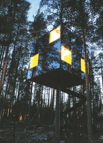(图片来源:中奢网) 现在来自世界各地越来越多的建筑设计师、室内设计师渴望加入这个团队,实现各自天马行空的设计理想。他们的下一个项目是做一个长长的管状会议室,实现在树上开会的梦想。在已经建成的树屋里面,有“隐形屋”之称的“镜屋”是最受欢迎的房间,由6个方向上的镜面组成,从地面架起12 米长的木板吊桥——肯特希望这些树不会因为人们要建房屋而就被砍掉,他希望这些树与树屋共生——事实上,就有一棵大树从镜屋的中间穿过,吊起树屋的钢索与树的链接都是可以调节的,每年树干都会变粗1厘米,而树屋的工程师们隔一段时间就会去看看是不是该给大树松口气,让它可以继续生长得更加粗壮。住这里的人都能感觉到的一点是,树屋的每棵树都是有灵魂的。 |