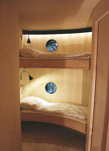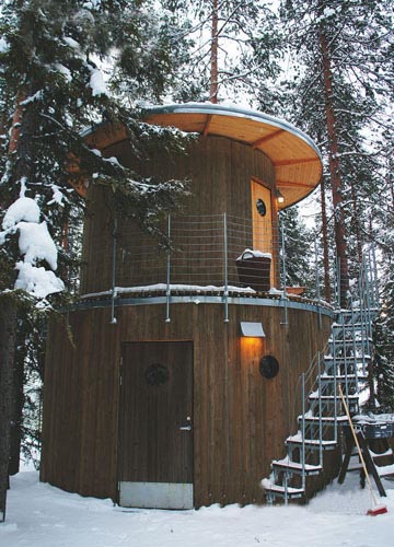 (图片来源:中奢网) 来到UFO 前,嘴巴因为惊叹就一直没合上过——这些极具视觉冲击力、天马行空的建筑设计好似一件件装置艺术,而最神奇的是,当我拿出钥匙插进树干上的开关里后,UFO 的旋梯自动降了下来,场景跟科幻小说中描述的一样。 肯特脚力好,这时候已经追上了我们,引领我们顺着旋梯爬进UFO。30 平方米的圆形房间分隔出了卧室、餐厅和卫生间,看上去是为两个大人、两个小孩的四口之家设计的,居然还配备了X-BOX,床品的图案是鲜艳的星空,与主题相当契合。 在这间距离地面6 米高的树屋里,厕所不是普通冲水,而是利用360 摄氏度高温将污物燃烧成灰烬。房间中的其他生活用水也是严格限量的,每天人工进行添加。洗澡可以去“树屋桑拿”,肯特帮我们启动了桑拿屋的设备,40 分钟后就可以享受了。在飘着雪花的冬夜山林间,今晚Tree Hotel 只有我们两个住客,桑拿蒸热了,完全可以把门打开,在雪地上打个滚儿,来一把最正宗的瑞典式桑拿。