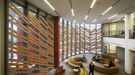 (图片来源:互联网) 这座图书馆不仅为学生、教职员工和社区提供了学习的场所,还有一系列特别的设置。其中一个就是入口处的大型透明雕塑,非常具有视觉冲击力;另外,二层有一座咖啡馆,顶层学校办公室旁有一座屋顶露台。