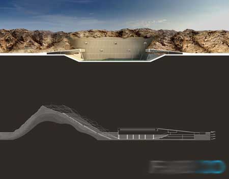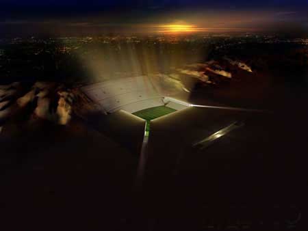 (图片来源:自由建筑报道) Al Ain体育场如同一处被掩埋的宝藏,沉入在沙漠当中,从地面上呈现给世人的只是一系列急剧倾斜的线条。这些线条以火山为背景,界定了体育场的空间格局,让参观者能够在巨大的景观设置当中观赏比赛。