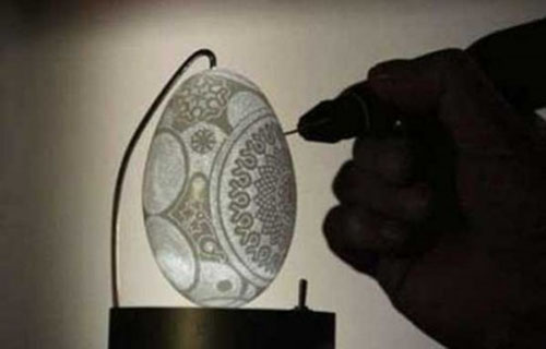 (图片来源:广州日报) 格罗姆首先在蛋的顶部和底部各扎一个小孔,让里面的蛋液流尽。随后,用一个小型电钻在蛋壳上钻孔,逐渐形成图案,譬如大小不一的圆孔,密密麻麻,连接最细处仅一毫米。