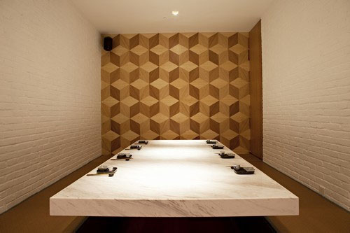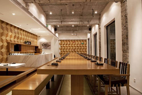 Sushi Abuse入围国际餐厅和酒吧设计大奖 Sushi Abuse由绿色设计革命的先驱A00建筑事务所设计。A00由3位来自加拿大的建筑设计师在上海创立,在项目开始之前,设计师曾多次前往日本,寻找有关日式空间设计的记忆与线索。Sushi Abuse的原址为上世纪60年代旧工厂的车间,空间高耸,线条简洁、内部十分开阔明亮。A00建筑事务所对Sushi Abuse的设计摆脱了单纯的文化标识,既体现了开阔的LOFT空间,又融入日本的装修材料,而在空间布局上却又完全不同于传统日式餐厅的紧密与封闭。 A00建筑事务所通过对混凝土、白色大理石、竹桌、木椅、几何墙面等装修材料的运用,营造出一个前卫而又平衡的现代日式空间,作为舒适前卫的用餐环境。在二楼大厅的中央,是可容纳40人就餐的上海第一长桌,在这上面可以看到一幅家庭聚会、公司活动、生日宴会的画卷。长桌旁边,另还有宽阔私密的榻榻米空间。在这个充满动感的前卫用餐空间里,时而窃窃私语,时而觥筹交错,充满了创意玩趣。
