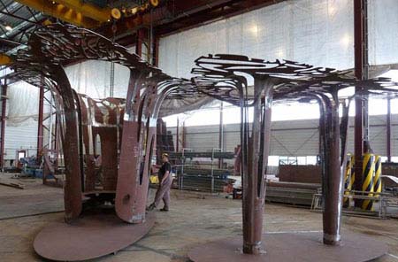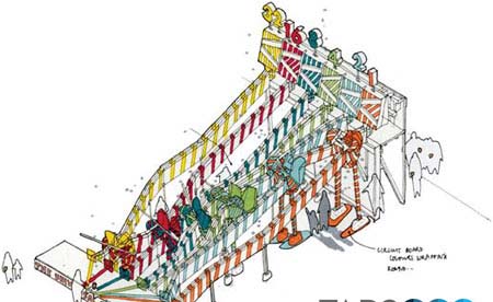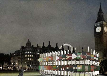 (图片来源:自由建筑报道) 这是一个全市范围内的布展活动,设计者包括学生和讲师。其中包括一座类似海藻蔓生的露台、一座以世界各地旗帜组成的屋子、一座制茶机器等。陈列的地点有特拉法尔加广场、南肯辛顿地铁站和议会广场等,时间是从7月26日到9月12日。