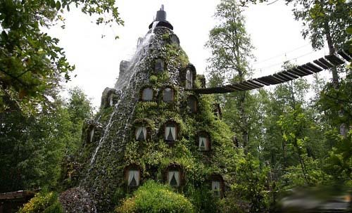 (图片来源:互联网) 悬在半空中的吊桥是通往宾馆的唯一通道 据外媒报道,在智利的原始森林深处有一所奇特的建筑,它形似火山,外墙被苔藓和杂草覆盖,游客要想进去,只能通过半空中的一个吊桥。这个犹如科幻片中的建筑实际上是一家旅馆。 据报道,这家造型奇特的旅馆位于智利自然保护区内,它杂草丛生的古朴外型和斑驳的内部陈设使人想到科幻电影中的场景,在这里,仿佛电影《指环王》中的小矮人随时都会蹦出来。这所旅馆的顶部设有喷泉,每天都会喷出水流,顺着建筑外墙汩汩而下。此外,通往这家旅馆的“必经之路”是一个悬在半空中的吊桥,想入住的客人必须走过这个摇摇晃晃的吊桥进入旅馆。 虽说这家旅馆有些与众不同,但环境非常舒适。客人可以到旅馆内的酒吧喝酒散心,也可以在巨大树干做成的浴缸里泡澡。此外,由于地处自然保护区,在周围闲逛时可能还会看到野生动物。据了解,这家旅馆的入住价格为每晚150英镑到260英镑。 |