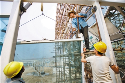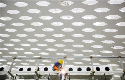 (图片来源:互联网) 工人们正在为航站楼安装玻璃。 走进了航站楼内部,来到位于中心指廊的旅客候机大厅。一进入航站楼内,最先感受到的是T3航站楼宏伟壮观的气势。其45万多平米的建筑面积是现在A、B号候机楼总面积的两倍还多,从T3航站楼的最北端走到最南端距离是1080米,步行需要约10分钟,深圳机场将会在楼内安装自动步行传送带,为旅客节省体力。 站在楼内朝上仰望,屋顶外立面所采用的六边形设计引起了记者的兴趣,这样的外立面设计从某些角度看像蜂巢,换个角度看又像水面的波纹,极富现代感。机场工作人员表示,根据国外的研究,六边形是让人感觉最为和谐的形状,这样的设计一方面是从美观的角度考虑,另一方面还可以充分利用自然光源保证航站楼内的光线充足,节能降耗。