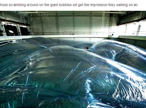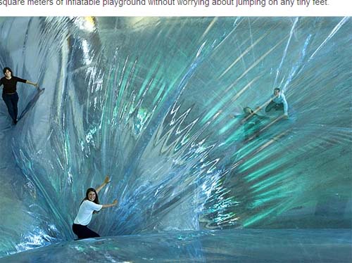 (图片来源:互联网) 报道称,这个建筑物是阿根廷艺术家托马斯·萨拉瑟诺(Tomas Saraceno)设计的,该建筑禁止儿童进入,成人踩在薄膜上会很快陷下去,但不用担心掉下去。薄膜的延展性可以让成人体会到小时候玩蹦床的感觉,人们可以肆意在这里翻腾、打滚。 这个建筑物面积达1200平米,由于面积过大,置身其中的人们很难分清方向,他们唯一能做的就是在顶层和底层之间摇摇晃晃的漫步。