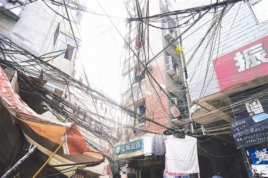 电线电缆穿梭交织,简直遮天蔽日。昨日,媒体在洪山雄楚大道卓刀泉南路的方家咀城中村口看到,各种电线交错编织在一起,最低的只高出行人半米多。电线上除了悬挂着周边村民和租住者晾晒的衣服,还兜着从高空落下的垃圾。有村民告诉媒体,每逢阴雨天气都不敢从线下走过,混乱的电线隐患四伏。