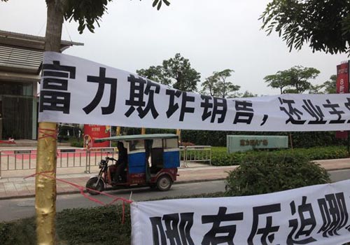 近日,位于广东省惠州市博罗县的富力现代广场频遭业主维权。记者在售楼处维权现场看到,业主挂起了“富力欺诈销售,还我血汗钱”等横幅对富力的侵权行为表示抗议。多位业主表示对人民网记者表示,如果富力不履行交房承诺,将维权到底,已做好进京上访及赴港抗议的准备。 事实上,作为民营房企佼佼者之一的富力地产,近年来在北京、上海、广州、成都、海南等地接连曝出产品质量丑闻。有业界人士表示:“富力地产建造的房子质量差是公开的秘密,富力几乎成为豆腐渣楼盘的代名词。”