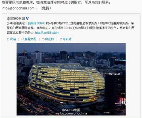 (2013年4月12日,北京)SOHO中国宣布了银河SOHO室内空气治理的实验成果,室外空气在经过净化处理以后可以达到近90%的PM2.5过滤效果,有效解决了室内PM2.5超标的问题,这在我国商业建筑中属于首例。当天,SOHO中国董事长潘石屹与美埃集团项目负责人陈玲,销售张陈怡等人,及包括业主/租户代表在内的各受邀嘉宾参观了银河SOHO的新风系统机房,并在办公楼内随机选点测试了PM2.5数值。美埃集团厂长陈玲事后对中新网表示,通过在新风系统增加两道过滤技术达到清洁空气的目的,目前很多写字楼是没有的,相信未来这个行业会有很大发展。 美埃集团承担银河SOHO.B塔和C塔的新风系统改造工程,和厂商霍尼韦尔一起参与SOHO的空气净化技术探索与试验。美埃现场演示了净化技术,新风PM2.5净化效率都接近90%,室内PM2.5值远低于国家标准(75微克/立方米)。通过美埃集团等净化厂商的努力,能让银河SOHO的业主、租户等使用者呼吸到健康干净的空气。