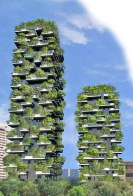 世界首个垂直森林——米兰双子塔楼效果图 “垂直森林”双子塔楼,已开始在意大利第二大城市米兰建设。它没有现代城市住宅的诸如混凝土、钢材和玻璃等标准元素,但将被覆以植被,准确地说是730棵树、5000棵灌木和1.1万株其他植物。负责设计这个双子塔的建筑师说,垂直森林造价6500万欧元,将成为世界首个垂直森林。 除使人赏心悦目以外,双子塔还将有助于净化城市空气,增加生物多样性,保护居民免遭太阳和噪音污染的伤害。这些建筑物上的植被将相当于一公顷森林,扮演着“生态广告牌”的角色。