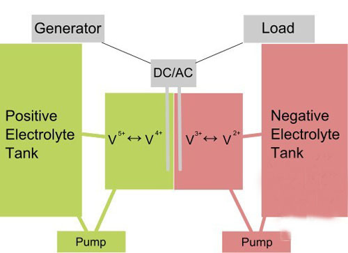 (图片来源:互联网) 液流电池原理 之前通常有一层薄膜让电解质分开,让他们交换离子的时候两种液体不混合。但往往使用的电解质成本不高,它们却要侵蚀价格并不便宜的薄膜,这也就大大缩短了电池的寿命。所以研究人员实现目标的最好办法就是直接撤掉薄膜的使用。 为了让两种液体不会混合在一起,研究人员采用了液流体动力学中的层液流技术将它们放置在容器中。电解质存储会跟电池本身分开,有两个槽装着电解质,这意味着电池的大小可以轻易控制,只要改变槽的大小就可改变电池的尺寸。发电量也会从几千万到几兆瓦不等。 液流电池电解质槽 除了尺寸可调节,液流电池还有更多的好处:“可以闲置很长一段时间不失去电荷、响应时间快、通过更换电解液可以很快地充电和放电”因为这个,前几年便有人推崇这个应该用来给电动汽车的快速充电。另一方面,液流电池比普通电池更复杂,每一个都需要自己的泵和传感器系统。而且能量密度比一般的锂电池要低。