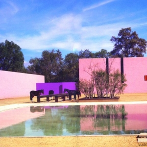 这座住宅和附近的马厩是属于艾格斯乔姆家庭的一处房产,位于墨西哥城的北郊,色彩鲜艳的高墙和清澈的水池形成了这边独特的风景线。 在入口处,墙体营造了一个独特的空间氛围,人们仿佛渐渐地被引向了远处的水面。水从一堵铁锈色的墙上溅落下来,注入池中,马厩的门也被巧妙地隐藏在了墙体后面。这面高墙和另外一面紫红色的矮墙组合在一起,环拥了整个庭院,马儿可以悠闲地散步。几十年过去了,这仍然是巴拉干所有作品中整体最为复杂的作品,但是也是在建筑元素方面最为简洁的。这个空间的体形简洁、明确。