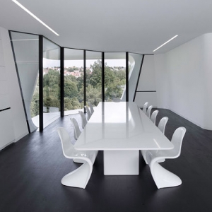Duplic别墅建筑的构图基于之前场地里老房子的基座轮廓。老房子建造于1984年,到重新设计时也进行了多次的扩建和改建。而新建筑通过对老房子的复制和旋转实现了对其的尊重与追忆。 新建筑被部分抬高,使得一层与上层建筑的随意叠加而形成了一个半公共的地面空间。别墅的独特表皮形成了建筑内外的完美连接,并提供了望向马而巴赫(Marbach)老城以及另一侧Neckar峡谷中的德国国家文学档案馆的壮观优美视线。