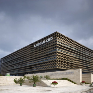 北京的HHD_FUN建筑师工作室完成了位于天津滨海的临时办公建筑楼,它的特点是图案状的金属表皮包裹着走廊。建筑的外圈是走廊,在建筑内可以看见外面的CBD地区。这可以让工作人员了解工地上的建设状况。表皮上的开洞的大小与不同房间的采光需求有关。