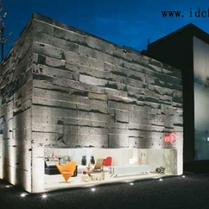 四四方方一个由大块水泥砖堆砌而成的长方体建筑,很像个大水泥箱子。外墙没有经过任何修饰与装潢,就这样赤裸裸地展现着水泥砖面的粗糙和坚硬。就连穿插钢筋之类的棍状物后留下的洞孔,也毫不遮掩的任其裸露着。乍看之下,总觉得像是一个还未完工的建筑。这个大水泥箱子三面封闭,临街的一面,只留有1/4大小的空白,作为橱窗,让人们能够看清里面的陈设。设计师认为,橱窗之于店面的最大作用,就是要以恰到好处的高度,充分展示店内商品的风貌。因此,VOLUME B的橱窗就这么刚刚好让人们可以欣赏到里面摆放的家具。设计师之所以产生这样特别的设计想法,其灵感也是通过观察店铺所在街道,有非常大的车流量却鲜有步行者而产生的。这样,当人们驾车驶过VOLUME B时,即便只有匆匆一瞥,也足以浏览遍店内所有商品。