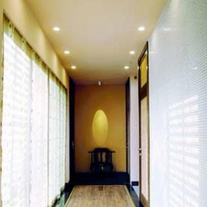 佛龛周围深浅不一的金色马赛克,整个墙面的色调,与吊灯的光晕极其协调。 用色彩施妆 新亚洲风格,代表了一种混搭风格,它作为整体风格贯穿整个居室后,印度、泰国、印尼等等的元素往上添加,都显得游刃有余。细节和软装饰构成了凸显风格效果的关键。 曾荣获“金外滩最佳色彩运用”提名奖的马莹麟,自然对色彩有高度的敏感力和高超的运用力。在她设计的希腊餐厅已可见一斑,她认为色彩的浓烈及其纯粹是营造氛围最好的“武器”。 客厅深处靠墙而立的床椅是喑哑的翠绿色,间或着斑驳的金色,凳脚上有细致的彩色雕花。床椅上供着一樽朱红色镏金的佛像,床椅前的铺垫是同一色系的草绿色。这一系列色彩与大理石的冷色调形成对比,既减少了局部空间大理石地板的亮度,又在质感上形成差异,为空间的恬静气质增添了妩媚。 同一区域的藤编沙发,衬着过道里深褐色的竹制门,坐垫和靠垫选用了清爽度高、提亮整个空间色度与亮度的白色。而在客厅入口处对称摆放的同一款式藤编沙发,则选用了黑色的坐垫与靠垫,使空间在视觉上就明显地分隔出主客厅与次客厅来。 色彩最极致的莫过于户外五六百平方米花园里的景色―人工挖造的水池里纯正得一如晴天碧海的蓝色;悉心打理的睡莲娇嫩欲滴的粉红;千里迢迢远道而来的石碑古旧的乳白;亭亭玉立的棕榈苍翠劲道的绿色……饱满色彩的点缀如同装扮起来的女子,即使再平常的面容也因此生气立现,明艳照人,显现出自己独特的丰韵。 日式房间外的走道,如同把户外小径搬入了屋内。多元化的设计已经逾越了内与外的界限。 自然即故乡 由于主人长期在外商务旅行,只在特定的季节逗留在上海。马莹麟索性把餐厅别出心裁地搭建在了室外依水而建的亭子里,只要摆上用餐必备的用具,既可以一边享受美味佳肴,又可以一边远眺河中随微风摇曳的荷花,颇有古人“举杯望月”,“对酒当歌”的雅韵。 所谓的风格,其实是一种文明或文化的物质化表现。如果说,我们最早认识的亚洲风格无非是情调酒吧里的紫色帷幔和香熏,那么我们忽略了亚洲文化是极其讲究自然材质的运用的,藤条,柳枝,木材,石料,流水,绿叶等都是必不可少的元素,所有的这些元素都在诠释浓厚的亚洲文化底蕴中所传达的雍容、沉静、清灵和温婉。 远行的人往往掬一把故乡的土,据说即便身在异乡也不会觉得孤寒。相信主人一定知道其中的深味,难怪花园中所有的装饰物都是主人从巴厘岛等地悉心挑选,不辞辛劳运送过来的工艺品。日本味道的路灯、中国风格的盆景、印尼石碑和石雕则是深刻的旅行记忆。 把这些单独的音符贯穿成旋律的就是自然的馈赠――花,鸟,虫,鱼,这首旋律只哼唱着一个主题――享受身体的极度舒适和心灵的极度静谧。自然本身就是人类最宽厚而温暖的故乡。