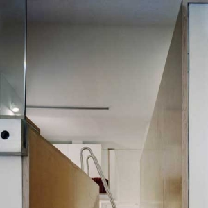 纽约Interlocking公寓室内设计。混凝土拱形天花板有起伏,两平台是由一个L形的T型台交叉,盘旋组成壁橱,从客厅到入境大堂,创造一个连续的视觉流动,而加剧了独特的功能, 所有的水平表面和T型台覆盖着枫树木材,而其余的垂直表面漆成白色。一个清晰的玻璃分割划分的休息区域,采用自然光照明,创造舒适的空间。