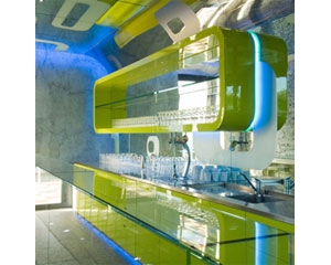 该墙的柜台后面用绿色涂料成的吊顶,背光是蓝色的霓虹光管。墙上的涂料掩饰了大门,浴室和壁橱。一个清晰的玻璃柜台,使嘉宾和调酒师成为一个更密切的关系。还设计完成了连续不锈钢岭柜与金属凳子。入口处的浴室和卫生间本身用炻瓷材料贴在墙壁和地板上。