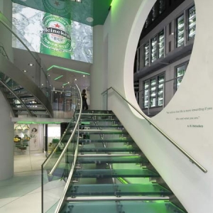 这家形象店是由六个建筑物所组成,其中还包含了一个衣饰店、啤酒吧、提供年轻音乐家使用的录音室以及海尼根规划的活动旅游售票中心。在室内整合了一个三层楼高的大冰箱和由冰块制成的logo。设计师宣称这间品牌形象馆是欧洲第一间全面采用LED光源的店铺。