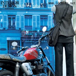 沿着楼梯的平板电视上不断放映着Zadig & Voltaire品牌主要参照物的视频形象:电吉他、摩托车、以及其它有关上世纪60年代的一些回顾。从广告宣传中放大的一些黑白照片包裹着一个柱子和铺满了走廊的墙壁。Stanislas 说:“这些照片代表着Thierry的世界,就像家里把照片挂在墙上一样。”惟恐这样的信息还不够清晰和响亮,她在橱窗里摆放了一辆经过改装的胜利牌摩托车。