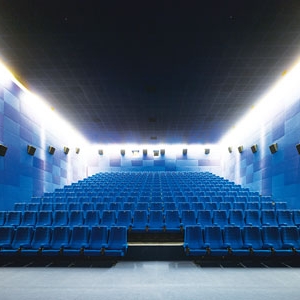 四个放映厅总共能容纳622人,各个厅的大小有别且颜色各异,用来放映不同风格的影片。因为不同的色彩可以给人以不同的心理感受,这一点对小众电影的播放影响尤甚。一号厅是最大的一间,可容纳279人观看,屏幕尺寸和剧场大小按照视觉的最佳比例设计。墙壁、地板和座椅都用了统一的蓝色调来降低周围环境对观众注意力的分散;二号厅里设置了155个彩虹般五彩缤纷的座椅,与灰色的墙面形成强烈反差,加强了戏剧化的效果,这里屏幕的长宽之比更大,适合放映宽银幕影片;三号厅有118个座椅,由于它在一楼酒吧的下面,而它的下面又是另一个休闲区,因此墙面、座椅和地板都选用了深红色来配合这种悬空的感觉;面积最小、只能容纳70人的四号厅是在一段楼梯之下的空间里建的,为了缓解空间的压抑感,墙面用了光谱式的彩色图案,座椅及地板则选用黑色。4个放映厅各有特色,里面的座椅都比一般电影院的更宽敞,更舒服,再大块头的人也可以舒展腿脚。每个厅里都设有固定的两个轮椅位,体现了通用设计的概念。此外,电影屏幕的设计比较有特点,它被装置在预置铝板系统外部,通过分控器播放影片。每组卷带面板都由阴阳螺纹接头固定,以确保所有设备暗藏。系统允许复杂卷带的安装,屏幕框架以铝材封装,以加强三维表达效果。该项目中,所有面板均由63mm石膏板制成,并直接固定在400mm高的水平凹槽上。为匹配铝板的使用,设计采用了镜面不锈钢作为入口、票房、咖啡厅/酒吧以及小商业摊铺的墙面材料。其结构支撑为固定在软钢架框架上的中密度纤维背板。这些设计手法为公共互动领域中的人流动线创造了可识别性。