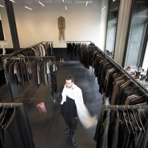 的确是在纽约。精品店坐落在一家有着百年历史的印刷厂之中,与之前的较小的店址相距几个办公街区之遥。这个1900平方英尺的新建空间承载着千年来先锋派艺术的所有特征:混凝土地板、灰色调子中的黑色笔触、庄重的概念艺术——至少艺术大师理查德· 赛拉(Richard Serra)与约瑟夫·波依斯(Joseph Beuys)是这样做的。曼恩认为,“在这种审美观的作用下”,他很幸运能够在开始工作时面对的是一个“相当原始的空间”,这里有着清晰的长方形平面布局,以及立面上大量的窗户。 曼恩还设计了专门展示配饰的桌台,由低铁玻璃、树脂复合再生纸以及坚硬的黑色钢材制成。曼恩指出,将空间一端界定为一间“房间”的方杆服装架也使用了黑色钢材。这种界线一直延伸到以钞票包裹的烟色玻璃柜台,台面长达16英尺,玻璃背面以灰漆涂刷。后部的三横排黑色抽屉也使用了同样的树脂复合再生纸,形成一个52英尺宽紧贴墙壁的网格。