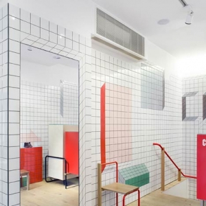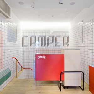 室内设计用10厘米瓦片将10号白格子连成横格线,但是这个模型被色彩缤纷的几何瓦片打断来创造壁橱的错觉和从外围看进来的蜃楼景象。空间里摆放着橡木做的长凳和柜台以及在阿朗索工作室的弯型铁管还有他们特意为这个项目做的陶瓷灯。这个商店名字叫做一起来露营,是这个牌子在伦敦的第五个商店坐落于考文特花园。