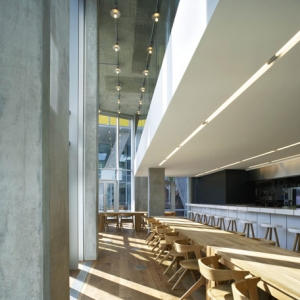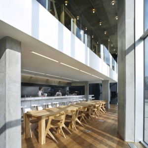 Found Associates伦敦工作室最近完成了伦敦西部的这家餐馆,室内的材料仅有一颗橡树和混泥土。餐馆的名字叫Nottingdale cafe ,这项工程包括增加了一个夹层,一个10米长的砌有瓷砖吧台。墙面直接被油漆成黑板,用来标注酒水单和特价食品。