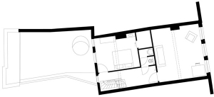 “洞穴房间”(vault room)两层搞,整个内部由木条板覆盖,开始和结束于渐变的拱形。顶部切开一个卵石形状的洞,自然光照入这个现代“洞穴”中。“洞穴”内部中性而原始,温暖的自然木材环绕着使用者,并且在视觉上扩大了房间体积。