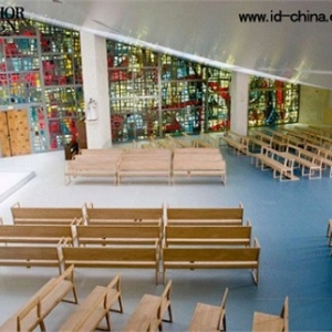 天主教徒多注重礼仪生活,阅读、默想、诵经是他们每天生活的重要部分。因此设计师在教堂室内家具设计中更考虑到了人性的关怀。室内所有的座椅都采用欧洲盛产的橡木,简洁的山形木纹、良好的触摸质感、柔和的色彩,将自然的气息带入了建筑内部,更拉近了“神”与人的距离。家具的组织形式分为几个不同的模块:教堂的中心为牧师的讲台,讲台与圣台和入口在一条轴线上,两侧分别摆放着一组相互面对的长椅,这是修女诵经、唱诗的地方,周边则是社会教徒落座位置。这种别致的座位摆放不但摆脱了以往固定的模式,其疏密有致的空间分配在安全消防方面也起到一定的作用。正如柯布西耶对建筑的定义:“饶有趣味地利用光照组合空间。”John Doe则在小教堂的室内改造设计中,巧妙地结合光照组合空间,同时将自然中的石与木纳入教堂内部,使人与自然相互融合,达到了主神、主人、主万物的境界。