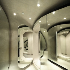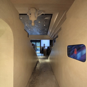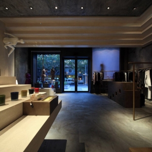在上海的店里,裸体模特儿坐在这个墙壁和天花板上。罗马设计师和上海的建筑师3Gatti建筑工作室设计,店内充满了冲突,服装及衣着附件的由混凝土楼梯而凸显。在商店后部升楼梯下方封闭的试衣间和贮藏室。地板上的存储悬臂前的小楼梯。铜管制成的栏杆,以及服装挂轨。