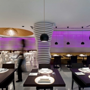 这是位于里斯本的一个日式餐厅,设计的目的在于反映日本文化的不同侧面。设计师想要通过新的材质,新的颜色和新的味道来使顾客每一步都感受到不同和惊奇。设计巨大的挑战是如何安排四个不同的部分:酒吧,寿司吧,餐厅和日本空间,同时还要隐藏它T形的平面图。坚实的玻璃结构通过将吧台内的活动暴露出来,展示出内部的动感,形成室内室外之间的联系,这个吧台可以活动,灵活性高,它被放在了入口位置。室内布局结合动感的元素,避免了顾客一进来就看见一个昏暗的走廊。
