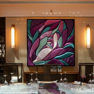 C、与同类竞争性物业相比,作品在空间布局上的设计创新点:迎合大堂“雕琢砌刻、繁庶市镇”这一主题进行创作,以嘉兴民俗作背景,提取民间的剪纸元素,将动植物以及带有喜庆色彩的汉字重构在同一画面当中,体现一片生机勃勃的繁华景象。矗立于西餐厅入口的钢板雕塑,造型提取于传统的民间图纹及民间剪纸,将大自然中水、陆、空各个领域的动植物丰富其间,用艺术的手法处理及升华,简练考究的造型与重构的艺术美感相融。其间的一件件事物,比喻成为生命唱着赞歌的歌者。