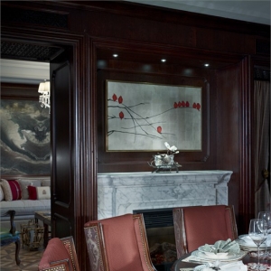 在陈设上,我们首先摒弃中式设计一定要中式陈设的惯性思维。我们认为未来的业主同样注重居住的舒适性、便利性,因此我们从国外家具资源中精挑细选了可以与我们中式装修相融合的西方家具,例如一些典型的英式风格家具就曾经受到过东方风格的影响。这些家具很自然的与我们的硬装相映衬,另外我们在布艺选择及设计制作上面同样花费大量心思,力求整体以一种恰如其分的状态呈现中式感觉。在一些重点空间,我们甚至自己设计并订制了居其自己的中式家具,以满足房子本身空间体量的要求。其他一些陈设品,诸如挂画,我们都是针对每个空间自身的表情特征,专门找美术学院的艺术家订制而成的。这种精细化的设计最终达到了软硬装极大的融合,使整个中式大宅的室内完满的以统一协调的风貌呈现出来。