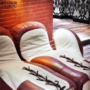 Sofield在设计中尽量不使用着色平淡的石膏板材质。当客户要求设计一个拳击区域的时候,他立即想到了丝绒墙面涂层。“当时David立即露出了微笑,”他回忆道。相邻的走廊也用这种毛茸茸的黑白两色织锦图案予以装饰,走廊墙壁的壁龛前摆放着一尊真人大小的米开朗琪罗的大卫雕塑。大部分走廊的地面都用复合木地板铺设,复合木地板的表层是经过碳化处理的木材,这样原有的木质本色完全显现了出来。位于地下室的普拉提健身课程教室也同样铺设相同的木材,这个地方被Sofield描述成为一间“禅房”。