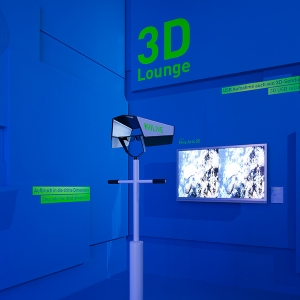 这是一个动态走秀和产品演示相结合,公平的设计可视化Grundig的品牌动态。在消费领域提供了一个辉煌的舞台走时装秀以及展示产品。该机型路线贯穿的主题领域,抽象折叠蜿蜒而过。细长的蓝色喜气洋洋的灯浮在天花板下沿空间的对齐交错排列,突出品牌动态。