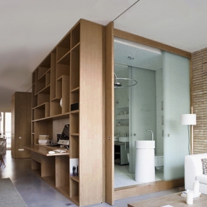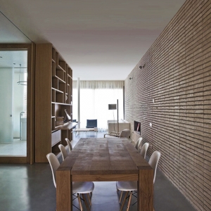 此外,根据空间由于几何图形的住房,所有不同的功能只能容纳一个灵活的和非常规整的分布,连接和分离空格,甚至改变空间功能。新的分配由一个透明的大和宽敞的公共区域运行,从门面的外观,和一间私人卧室套房和客房浴室形成的半封闭歌剧。公共区域是由门厅,餐厅,图书室,工作室和起居室展开,在门面后方的是厨房。所有这些材质都是手工制作的实心粘土砖墙沿纵向对齐。卧室位于高柜、门厅衣柜和卧室衣柜之间,一个大木芯包含两间浴室,这已经成为摄影棚区的货架上家具的双重功能。家具隐藏了两个大的滑动木门,允许的独立性两个不同的空间:卧室,将公共区域隔开,客厅的一部分,包含一张沙发床,作为客房使用。