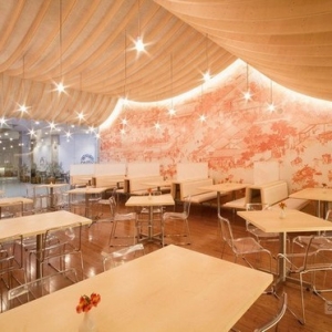 厄瓜多尔餐厅设计这份喜爱在邀请Hou de Sousa事务所为其进行店铺设计时也表现得淋漓尽致:天花板的形式和轮廓来自于中国的寺庙,墙壁上贴着张择端的《清明上河图》长卷,整个空间随着穹顶曲线和画上的河水一起流动。