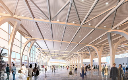 新航站楼一楼设计为到达大厅,二楼为出发大厅和候机大厅。两层楼间采用下夹层指廊和剪刀式固定登机桥,使出发、到达港旅客互不干扰,实现快捷高效的旅客分流。