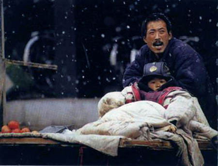 塞外的春天乍暖还寒。4月的一个早晨,天空飘洒着纷纷扬扬的雪花。 一个中年男子的菜摊车上坐着一个小男孩, 孩子用给菜保温的被子围着,父亲不时用手给儿子掖掖被子。 在阴暗的背景和漫天飞舞的雪花的衬托下, 儿子稚嫩红润的小脸与父亲饱经沧桑的脸形成对比, 父子俩面对生活的艰辛相依为命,特别是父亲使劲发出叫卖声时, 脸部表情感人力度之大,使人看后心灵为之震颤, 这就是生活在贫困山区的父子,他们一生别无所求。只求有一块属于自己的土地。 也许一辈子他们都不知道外面的世界是什么样子。 他们没上过楼梯,没打过“的士”,没进过电影院, 可就是朴实勤劳的人们一代代的供养着我们。 皇天厚土无以回报。爱他们吧,至少在感情上尊重他们。否则我们还谈什么人性?