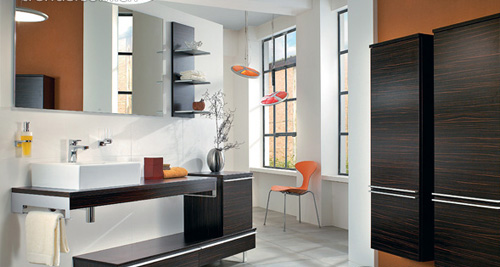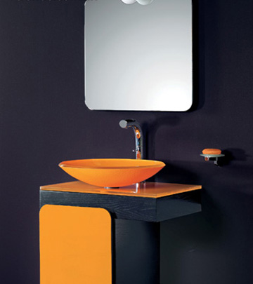 15.色彩元素装点卫浴间 浴室的色彩一般都很单调,特别是洁具产品。这款浴室柜融合了色彩元素,台上盆采用橙色玻璃材质,与柜门、台面的色彩相呼应。柜子的面板是玻璃的,更加容易清洁。单柜门设计,可以满足单身人群的物品放置。简单利落,装饰效果很好。